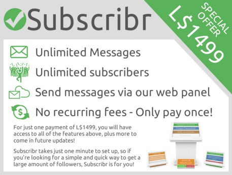 Subscribr is a service which provides cheap and reliable notifications to your customers, followers or anyone who wishes to recieve messages and regular updates from you! Our service allows you to send a message to a whole database of your subscribers throrugh an easy-to-use web panel and in-world inventory server!